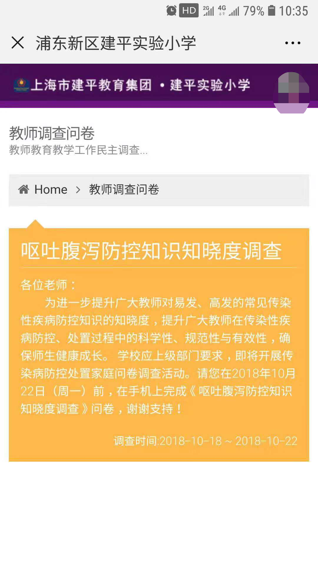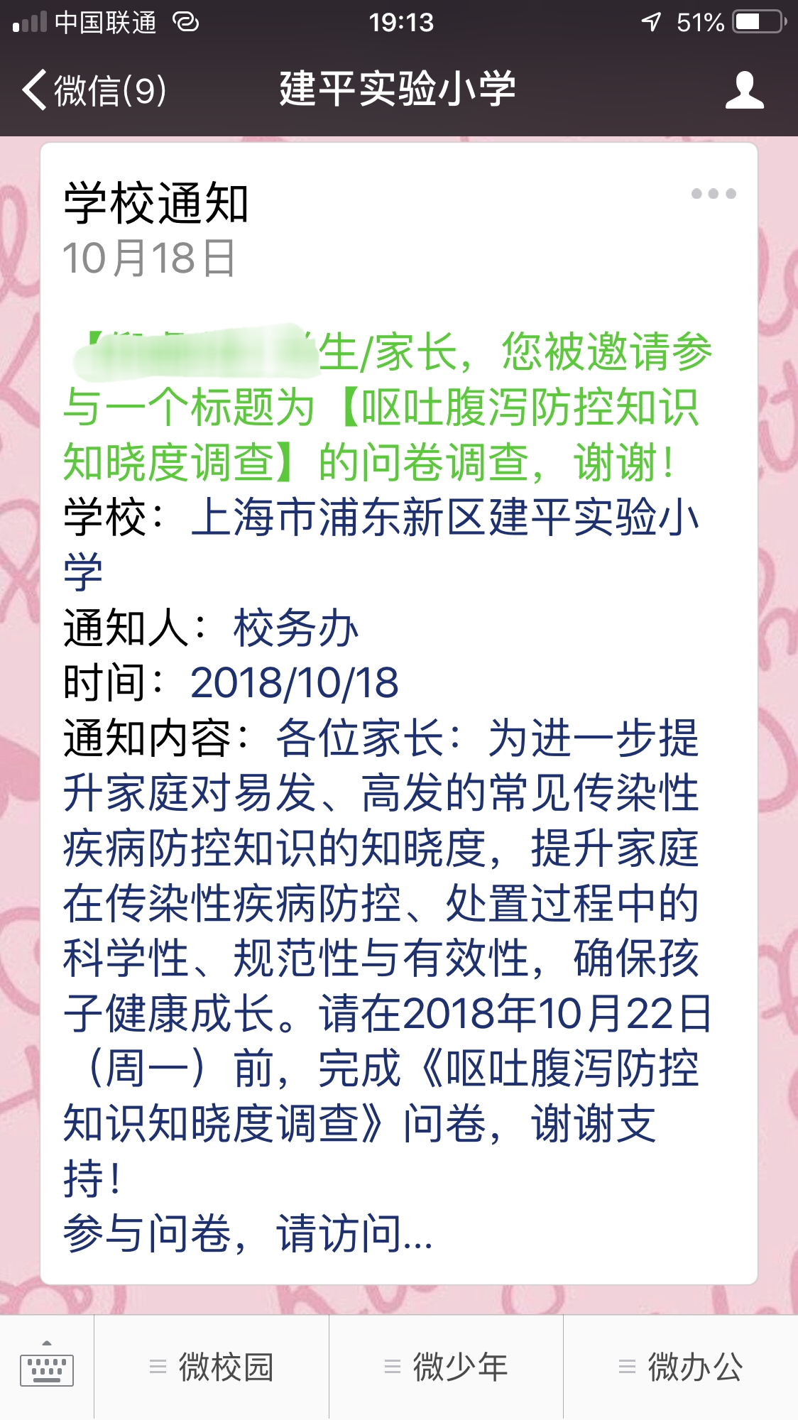2018年10月18日,建平实验小学3700多名学生家长的手机上都出现了这样一条提示:各位家长,为进一步提升家庭对易发、高发的常见传染性疾病防控知识的知晓度,提升家庭在传染性疾病防控、处置过程中的科学性、规范性与有效性,确保孩子健康成长。请您在2018年10月18日(周一)前,在手机上完成《呕吐腹泻防控知识知晓度调查》学生问卷,谢谢支持!