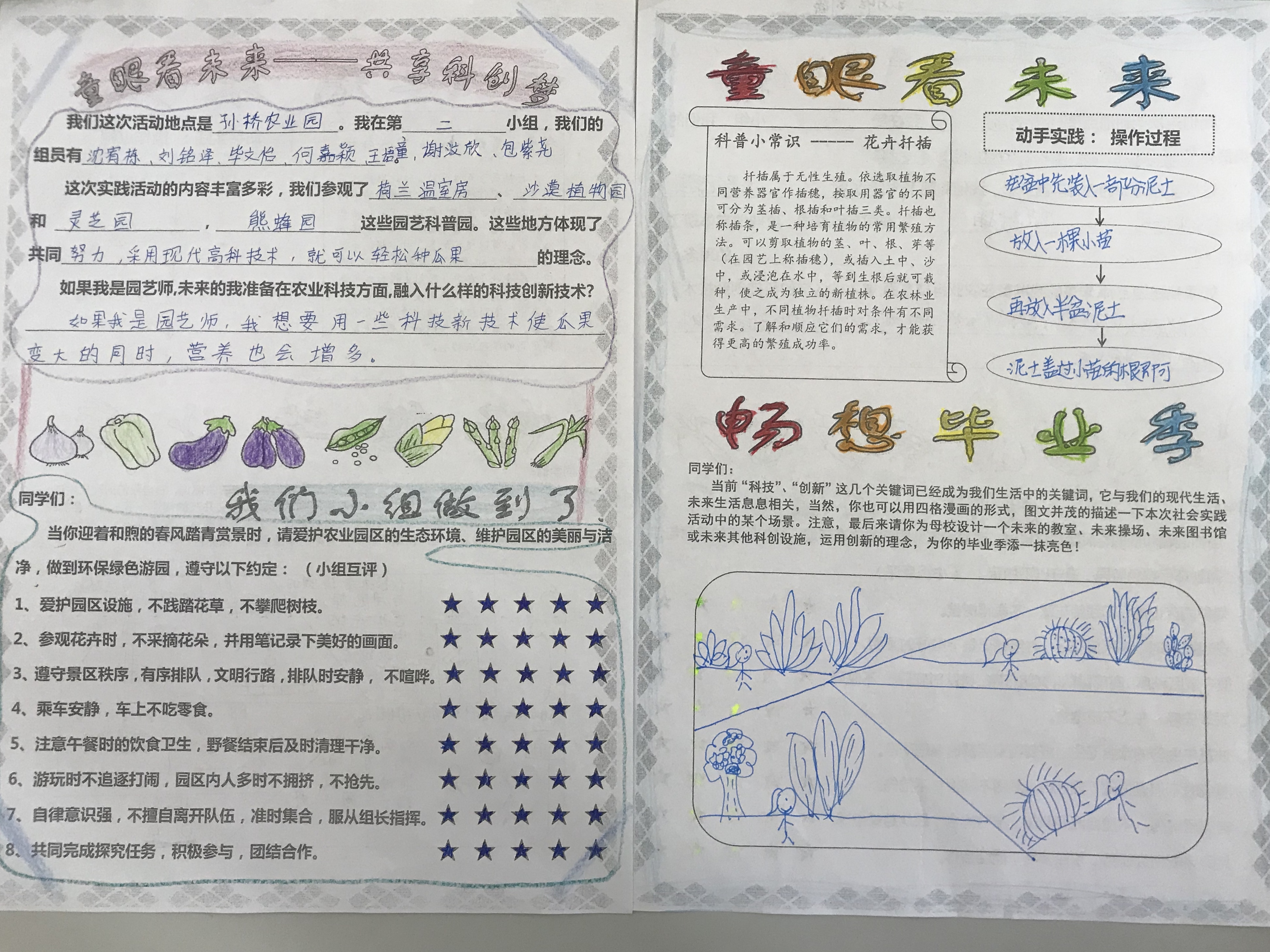 同学们不仅收获了快乐、友谊,在春游结束以后,同学们还结合了春游的过程中的所看所思所获,并发挥自己的想象力完成任务单。让我们一起来看看,未来的他们准备在农业科技方面融入哪些科技创新,有些同学打算融入纳米技术,减少农业污染;还有同学想融入缩短农作物成熟时间的技术,来生产出更多的农作物;还有些同学想融入自动化的技术,让种植、采摘、施肥、除虫、除草都能靠机器完成……在任务单上《畅想毕业季》板块,请你为母校畅想一个“未来教室”。很多学生画了“未来音乐室”、“未来美术室”、“全能操场”……他们用丰富的想象,绚丽的画笔,给小学生涯的“五童实践活动”画上了一个圆满的句号。