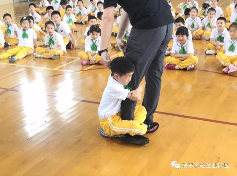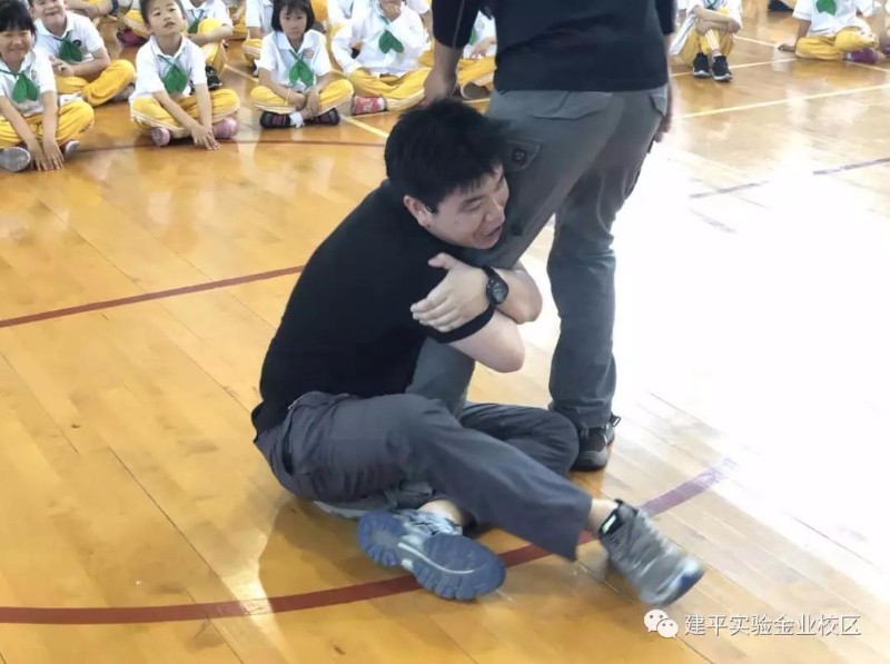 当在正面遭遇坏人时,我们一年级的小朋友可以怎么做呢?迅速坐于地面,双手置于身后,并控制方向,正面面向坏人,双脚前后踢向坏人膝盖附近,同时发出短促、有力的“坏人,坏人,110”口令。又或者“抱大腿”:紧紧抱住坏人小腿,一屁股坐在坏人脚面上,双脚交叉牢牢夹住,用力拉坏人膝盖后部韧带并向后躺倒,注意头部不能放在坏人两腿之间,这样坏人绊倒后,会压住自己,逃不了,最重要的是,坏人摔倒后迅速向反方向逃跑,以免被再次抓住。