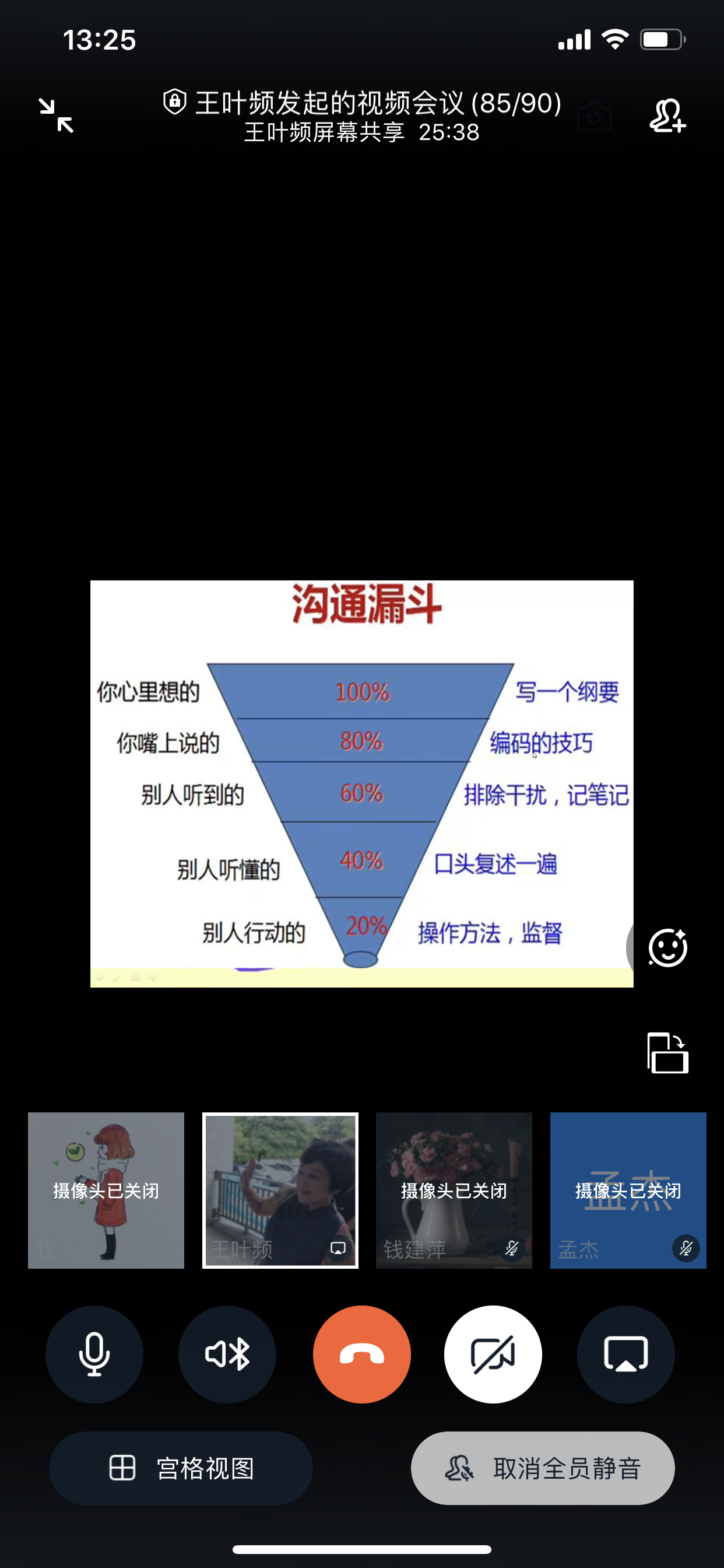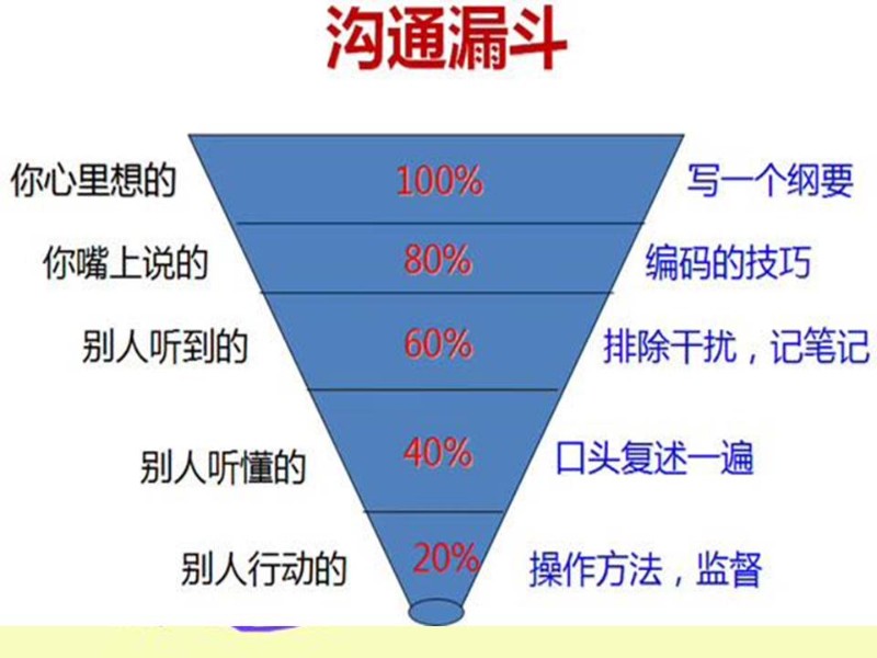 随后,王叶频副校长进行主题为“沟通与执行”的班主任校本培训。讲述了“沟通漏斗”的概念。“沟通漏斗”呈现的是一种由上至下逐渐减少的趋势,因为漏斗的特性就在于“漏”。对沟通者来说,是指如果一个人心里想的是100%的东西,当你在众人面前、在开会的场合用语言表达心里100%的东西时,这些东西已经漏掉20%了,你说出来的只剩下80%了。而当这80%的东西进入别人的耳朵时,由于文化水平、知识背景等关系,只存活了60%。实际上,真正被别人理解了、消化了的东西大概只有40%。等到这些人遵照领悟的40%具体行动时,已经变成20%了;只有掌握一定的沟通技巧,争取让这个漏斗漏的越来越少。才能让执行效率事半功倍。