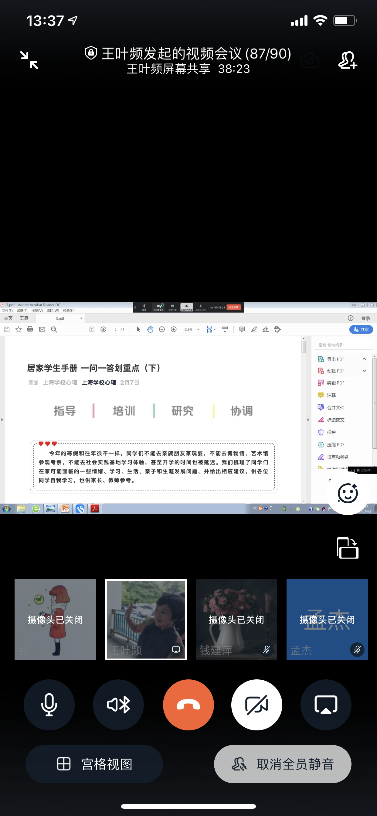 最后王校长带领全体班主任对近期上级下发的部分文件进行解读:《中小学和幼儿园新冠防控指南》、《居家手册》、《中小学生防控心理调适手册》,让班主任明晰学生居家期间的班主任职责,以及班级学生心理排摸、心理疏导小技巧,并通过组织班主任开展案例分析题和情境问答题等形式完成网上作业跟帖,共享教育智慧。