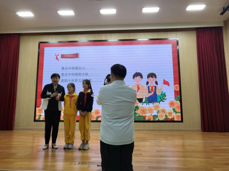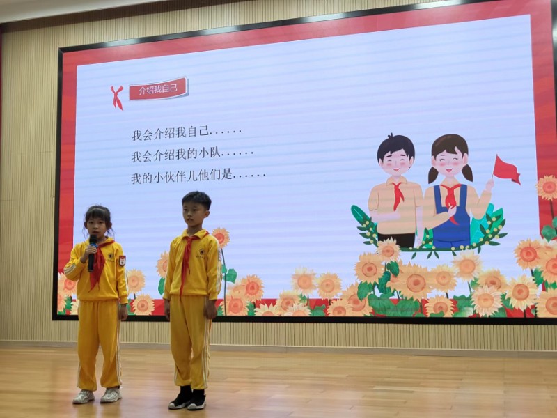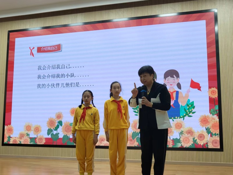第三环节胡老师邀请各年级的队员组成小队,让他们从1.介绍我自己2.介绍小队的成员3.介绍小队特色三个方面展开进行讲解。最先上场的是五年级小队,他们为自己的小队取名为“葵学”小队,寓意为队员们像葵花一样向着党,热爱学习,天天向上。四年级小队取名为“红旗飘扬”小队,他们介绍自己的小队的队员各具特色,性格互补,热爱阅读。最后上场的三年级小队也丝毫不逊色,取名为“火车头”小队,胡老师则留意到了小队中一名落单的队员,并嘱咐两名队长要学会冷静思考,学会“两只耳朵,一张嘴”——多去倾听。队员们都感觉获益良多。