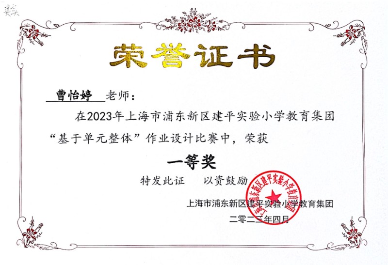 曹怡婷老师,在2023年上海市浦东新区建平实验小学教育集团“基于单元整体”作业设计比赛中,荣获一等奖。